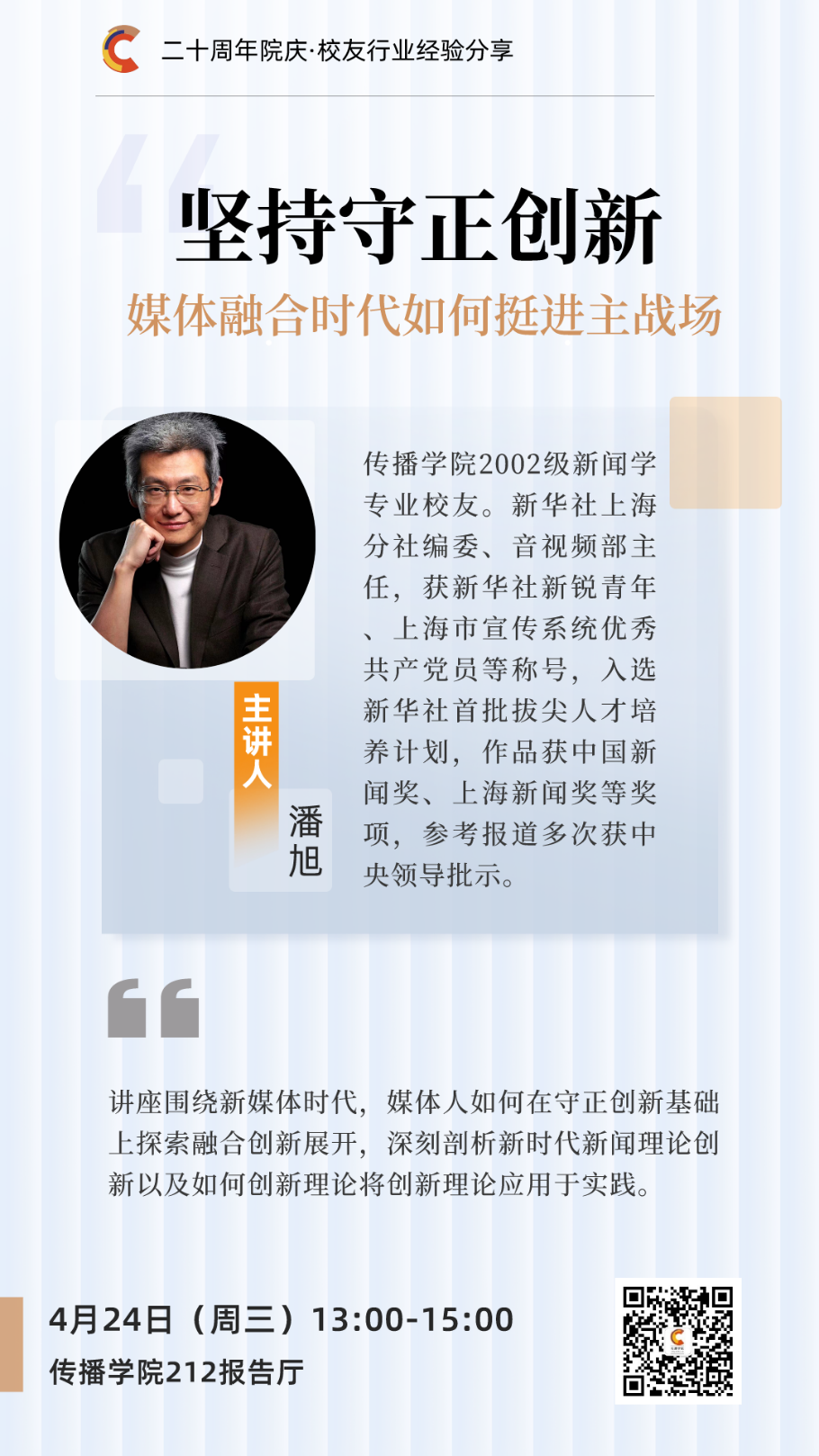 讲座围绕新媒体时代,媒体人如何在守正创新基础上探索融合创新展开,深刻剖析新时代新闻理论创新以及如何创新理论将创新理论应用于实践。