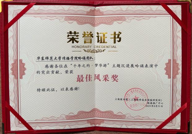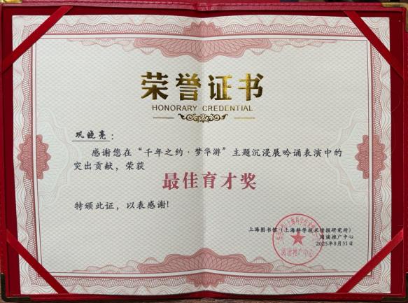吟诵团队凭借出色的艺术呈现荣获上海图书馆颁发的“最佳风采奖”,指导教师巩晓亮被授予最佳育才奖。