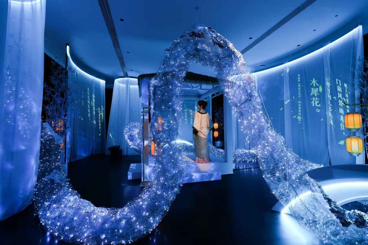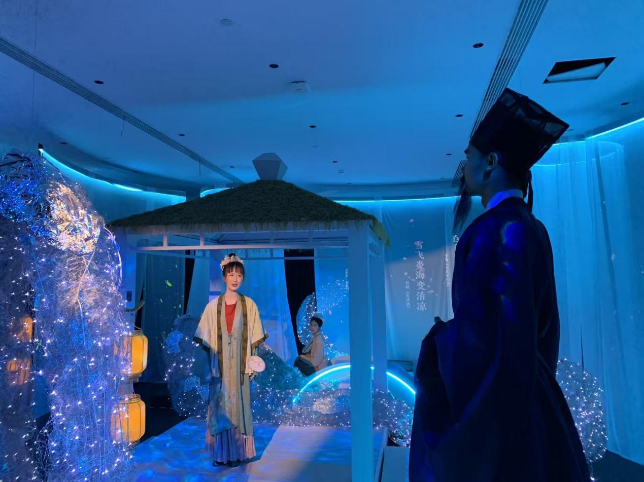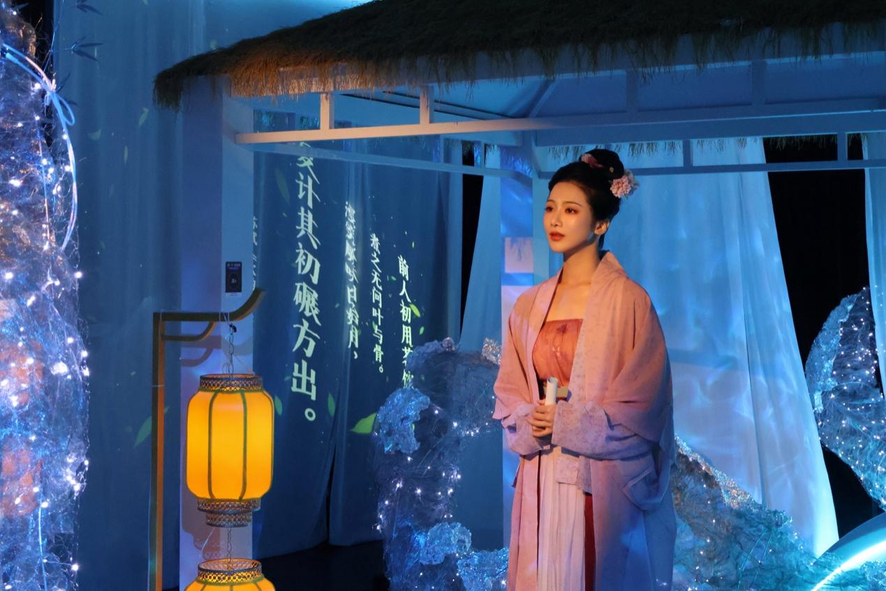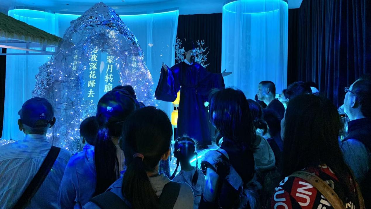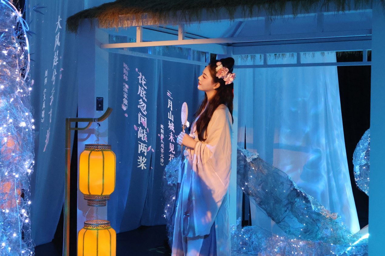 在曲水云深处。一场宋代文人的“星河诗会”正静候游人的光临。竹枝在光影中若隐若现,脚下波光粼粼,仿若行走于蜿蜒溪水之上,引人 “沉醉不知归处” 。抬头望去,古典诗词在纱幕与墙壁间流转不息。 同学们用声音与情感,为千年前的诗词注入了温度与生命。当古典诗词从书本中“走”出来,在光影流转间被深情吟诵,它便不再是需要背诵的文字,而是能让我们真切感受、触摸,与之共鸣的生命体验。年轻一代不仅是传统文化的继承者,更是富有创意的“唤醒者”与传播者。