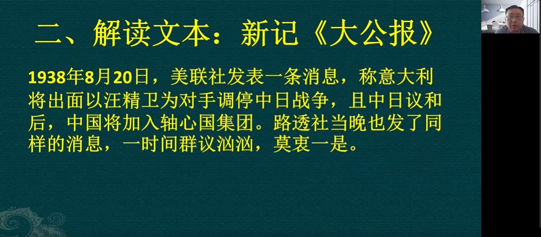 首先,俞凡教授以新记《大公报》的个案研究为例,阐释档案材料对于解读报刊文本的重要作用。他指出《大公报》是一份非常特殊的报纸,该报在抗日战争当中发表过很多著名的抗日报道,奠定了该报长期以来的“敢言”之名,其“四不主义”的标榜、组织“星期论文”作者群等举措,都使得该报在知识分子当中具有巨大的社会影响力,他们在很大程度上充当了民国时期舆论领袖的角色。俞凡教授通过批阅台北“国史馆”收藏的蒋介石档案,发现该报与国民党上层有着密切的关系,许多言论直接来自于蒋的指示。俞凡教授认为,对于《大公报》这样一份特殊的报纸,只有借助档案材料理清复杂的历史背景,才能品读出一些重要社论和报道的言外深意。