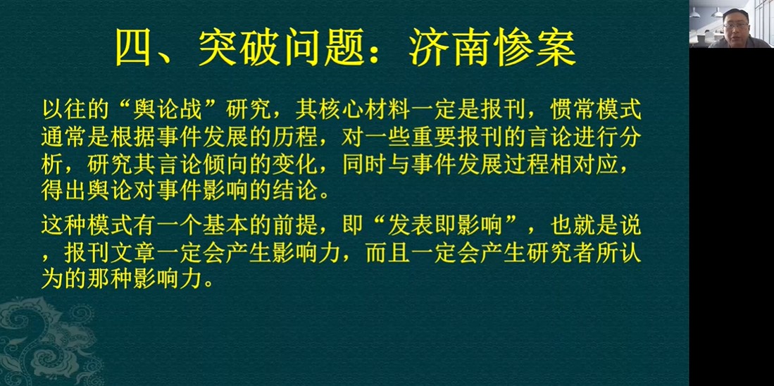 随后,俞凡教授以“济南惨案”的舆论战为例,探讨了舆论问题的重要性以及舆论对决策的影响。俞凡教授指出,学界从外交史、政治史、军事史角度对济南惨案的研究已相当深入,但从舆论史角度着手的研究过去并不多见。进一步,俞凡教授以外交档案为核心依据,梳理了中日两国政府在这场舆论战中采取的方针与措施、舆论对“济南惨案”交涉的影响。俞凡教授认为,日本当时国际舆情应对体系已建立、运转得相当完善,而蒋介石政府则缺少对国际舆情的重视,因此“济南惨案”爆发之初日方通过各种操作极大争取到了国际舆论支持,而中国在国际舆论上则被漠视,这一状态直至日本增派第三师团在欧美引发舆情,进而导致金融市场的剧烈动荡才得以扭转。