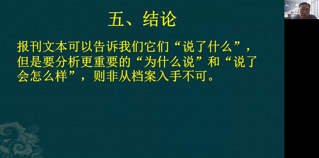 最后,俞凡教授对讲座内容做出了总结概况。他指出,报刊文本是非常重要的研究资料,但我们不能只是看报刊,更重要的是去看他为什么这样说,并且说了之后的后果是如何的。若想要解决以上这两个问题,就必须从档案入手。所以在做新闻史研究时,应当尽量跳出以报刊文本为主要对象的窠臼,转向丰富的档案文献当中去寻找新的问题,寻找新的思路,由此推陈出新。