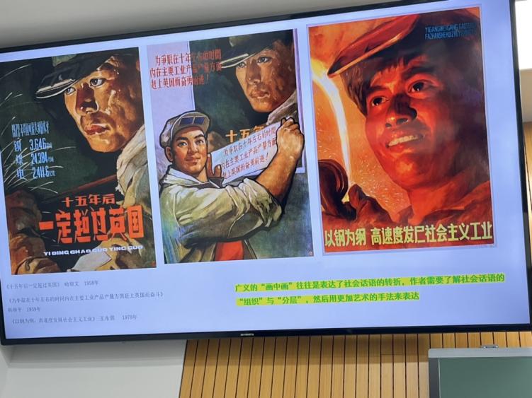 沈榆老师用多幅宣传画的案例分析了狭义的“画中画”与广义的“画中画”。狭义的“画中画”常把一张画贴进另一张画,其特点是重复,如宣传画《听志愿军叔叔讲故事》。而广义的“画中画”往往是表达了社会话语的转折,作者需要了解社会话语的“组织”与“分层”,然后用更加艺术的手法来表达,如宣传画《以钢为纲,高速度发展社会主义工业》,以工人为题材,用仰视展示工人自信,色彩运用更加讲究技巧。