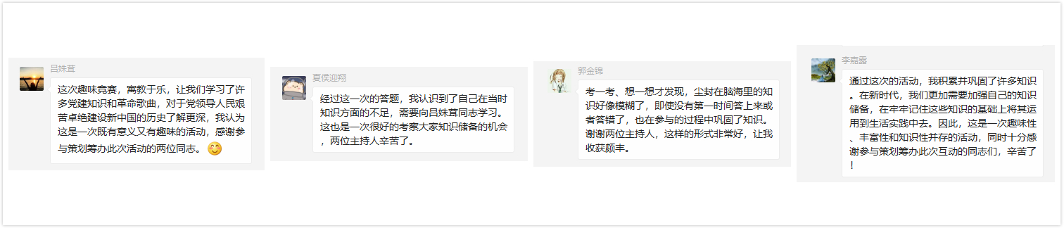 最后,党支部书记何柳萍对本次组织生活会发表总结:“中国共产党的领导是贯穿党史、新中国史、改革开放史、社会主义发展史的主导性实践逻辑,通过深化四史学习可以让我们对党的领导国家的发展有更深刻的理解,更了解时代的使命也更明确肩上的责任。在本次主题党日我们通过党史学习和知识竞赛重温了党的发展历程,内容充实,形式活泼,希望同志们通过学习能够加深对党的认识,在实践中守初心、担使命,在思想和行动上坚定理想信念践行党员担当。”
