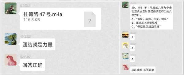 知识竞赛共分为必答题、抢答题和猜歌名三个环节,党员按照3人一组的方式分为6组参与竞赛,各位组员的总分累计为小组分数。在必答题环节,主持人按照微信群成员的顺序逐一进行提问。抢答题则根据顺序的前后和答案的正误进行评判。猜歌名环节中,主持人将题目以录音文件的形式发送到微信群中,仍然以抢答题的标准来进行分数的评判。