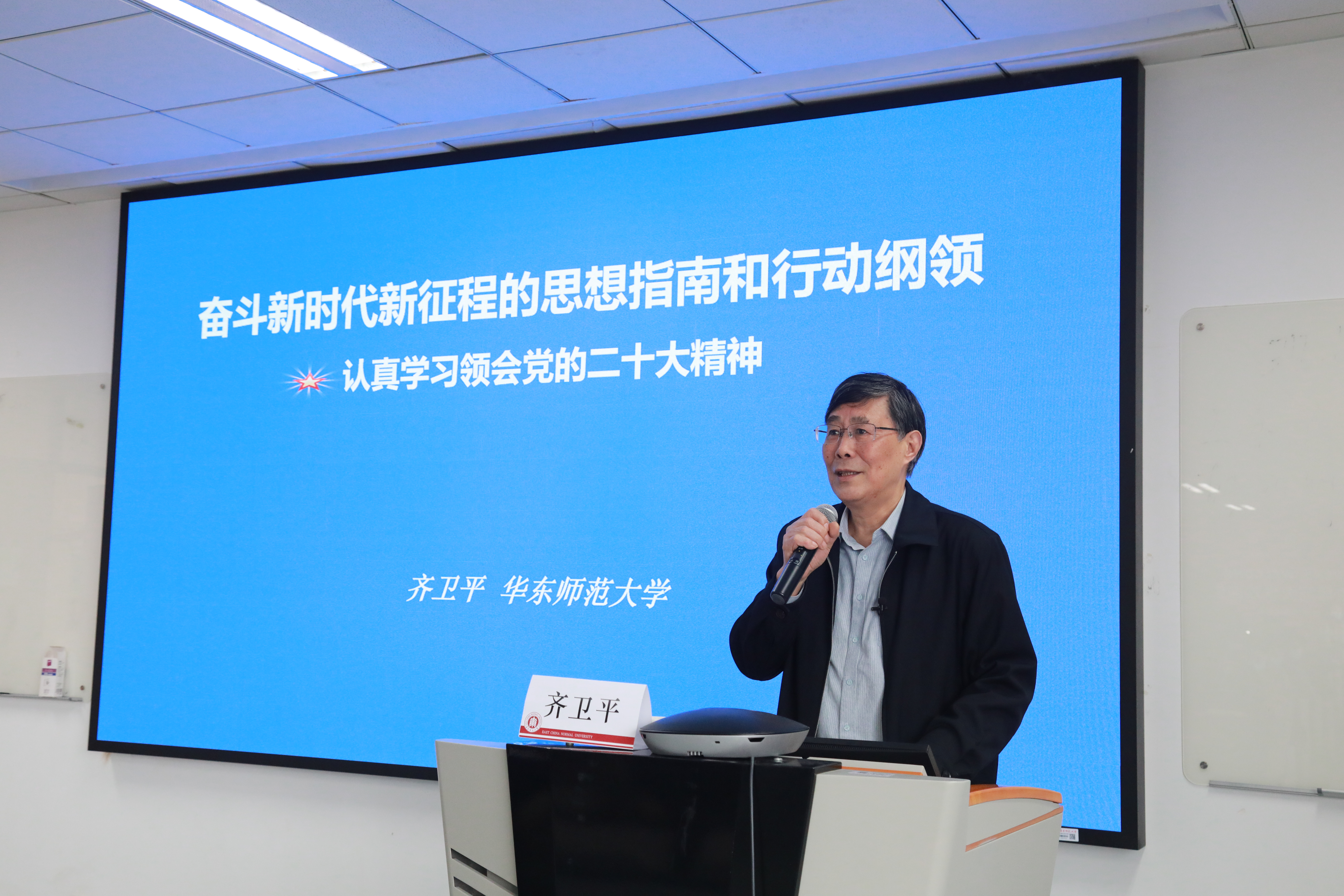 齐卫平教授以“奋斗新时代新征程的思想指南和行动纲领——认真学习领会党的二十大精神”为题,从“深刻认识党的二十大召开的重大意义”、“深刻理解党的二十大主题”、“认真学习党的二十大报告的主要内容”、“奋力谱写更加绚丽的华章”四个部分,对党的二十大报告进行了全面深入的辅导阐释。