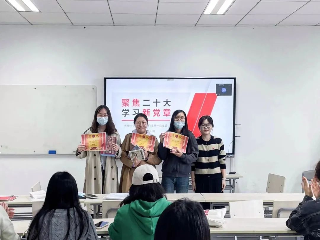 会议结束后,支部为上个月组织生活即“学习党的二十大报告”专题学习会的评比结果进行简短的颁奖,三位优秀小组汇报的获奖代表上台领取了奖状与奖品。党的二十大召开以来,支部已经通过集中收看、党员领学、学习小组交流学、支部观摩互动等多种形式,掀起二十大精神学习热潮,引领带动支部党员真正学到实处、见到实效。