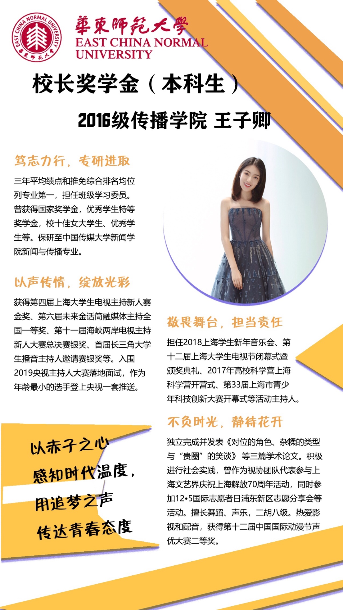 那天我来到校长奖学金答辩现场,发现“第一名”、“奖学金”这些标签都是大家的“标配”。当我看到自己留在天南海北比赛的足迹时,我找到了自己与大家最大的不同,那就是我一定是最珍惜每次表达机会的人,因为舞台和直播不允许出错。四年的旅途里,我获得了上海大学生电视主持新人赛金奖、未来金话筒融媒体主持全国一等奖以及海峡两岸电视主持新人大赛总决赛银奖,从一名赛场“炮灰”变成了未来金话筒赛区冠军。今年夏天,我很惊喜的收到了中央广播电视总台主持人大赛的面试通知,身边的赛友从也从学生变成了业界前辈。作为还没有从业经验的学生,我也成为了“年龄最小的选手”登上了央视一套推送。比赛对我来说,从来不是拿奖证明自己,而是通过这条路与梦想走的更近。所以我从赛场走上了大大小小的舞台,担任了2018上海学生新年音乐会、上海大学生电视节闭幕式的主持人。