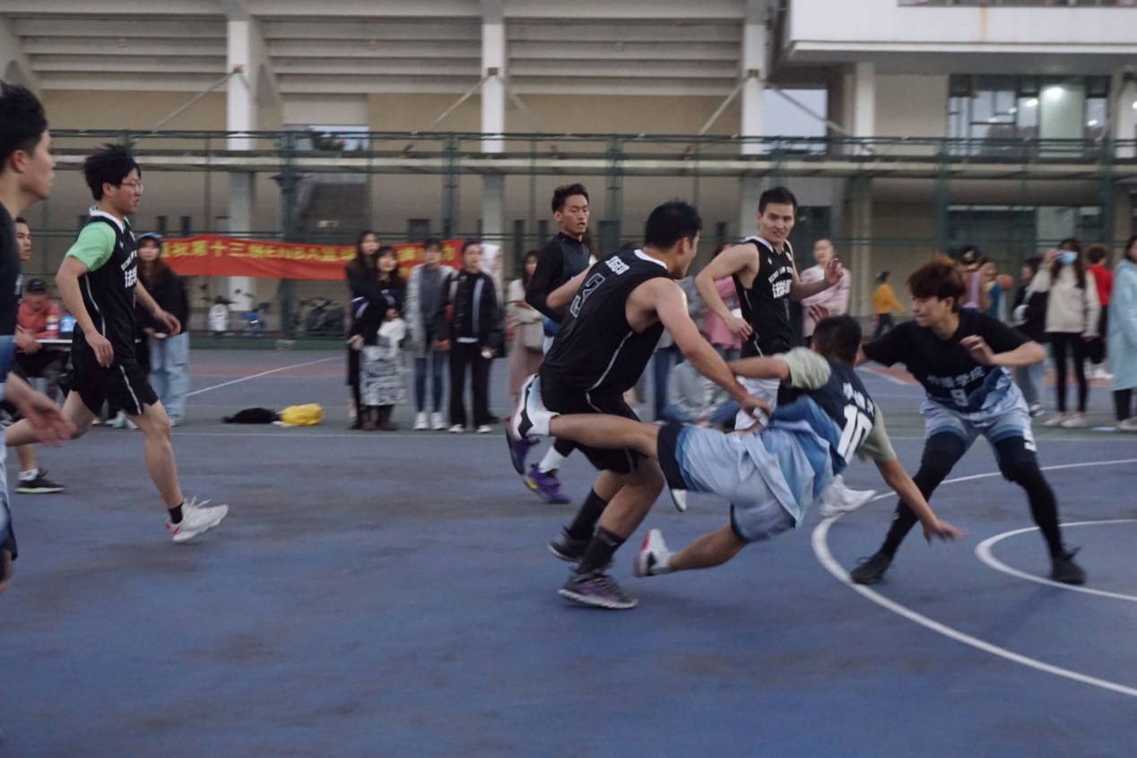 比赛进行到上半场尾声阶段,双方逐渐找到了状态,胶着于篮下,我院球员与对方球员不断起跳抢夺篮板,你来我往,最终我方球员设法摆脱防守,一气呵成,瞬间连进两球。