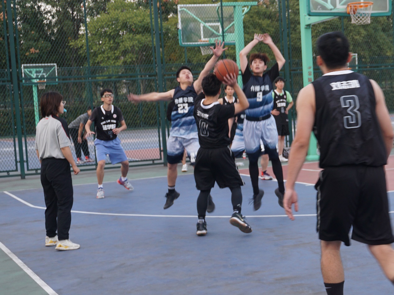 比赛接近尾声,而场下啦啦队的加油喝彩声仍不绝于耳,队员们仿佛受到同学们的鼓励,不放过任何一个得分的机会。5号队员胡伯俊变向过人,起身投篮,球在空中划过一道完美的弧线,不偏不倚落入篮中,为我院赢得了三分。