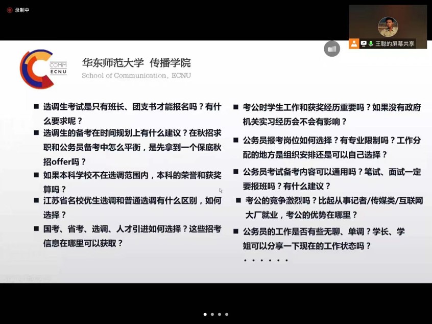 为了帮助同学们深入了解“公务员”和“选调生”的相关就业政策,解答同学们的未知和疑虑,由就业发展中心主办,h动漫 承办的“生涯启航月”活动——传播学子公务员选调生就业经验分享会于2021年11月2日晚在h动漫 115室举行。本次分享会以线上的方式展开,邀请到三位有成功经验的学长学姐为大家分享求职经历、就业经验和入职感悟。共有60余名同学参加本次分享会。