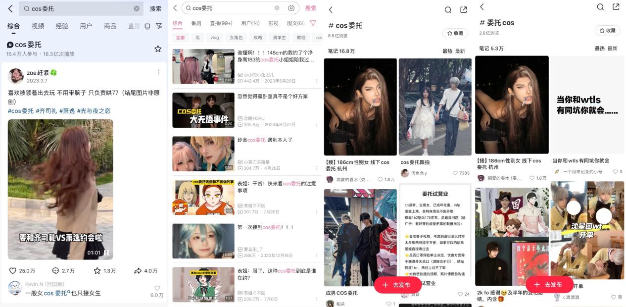 这一新兴市场在各大社交平台上呈现出蓬勃发展的态势。在小红书上,和“cos委托”相关笔记已超过20万条,总浏览量已破10亿;在抖音,cos委托的话题有15.45万人参与,相关视频累计获得了18.37亿次播放量;在B站,cos委托相关视频已经突破99+,其中播放量最高的视频已经达到442.4万。(数据来自新抖、新红、新站平台,近30天数据的截止日期为2024.12.2)