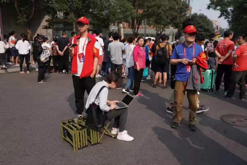 图:国庆70周年大会阅兵仪式现场杨欢抢稿的工作照
