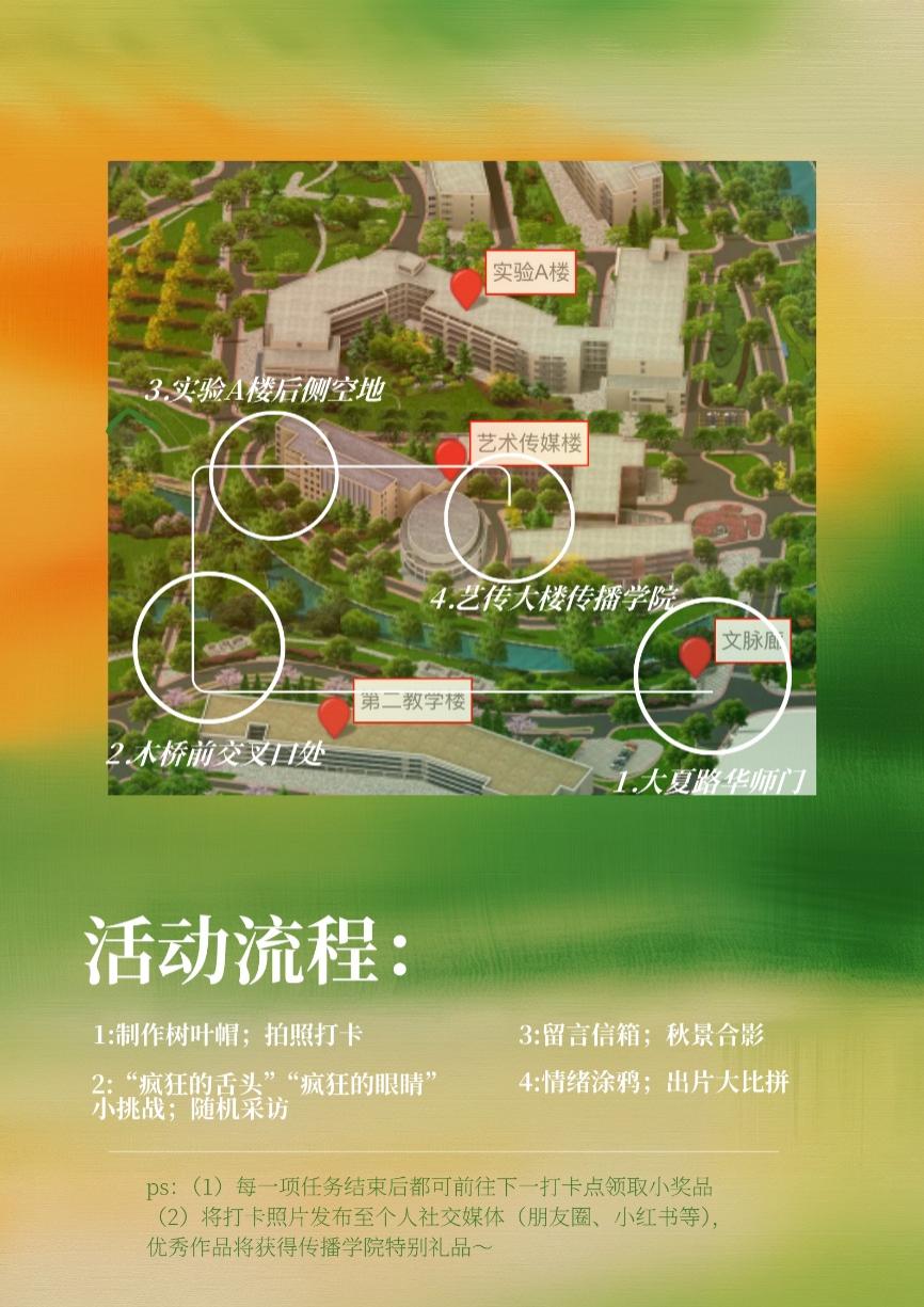 本次“秋日心声,自然治愈”秋日快闪以校园巡游打卡为核心玩法——我们精选校园内秋色最浓的黄金路段,串联成专属巡游路线,沿途设置多个主题打卡点。每个点位均配备特色摊位,带来融合h动漫 专业亮点的趣味游戏与沉浸式体验项目。所有赏秋打卡点均设有定制宣传牌,助力你轻松打卡分享,让秋意与快乐一起传播!