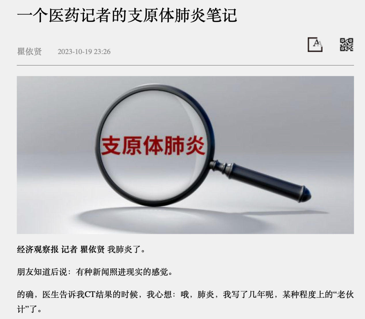 2023年10月,瞿依贤得了支原体肺炎,从旁观记录的记者变为亲身经历的病人。她总结自己看病的经历,以第一人称视角写下《一个医药记者的支原体肺炎笔记》这篇报道。在文中,瞿依贤将自己定位为一名“医药记者”。