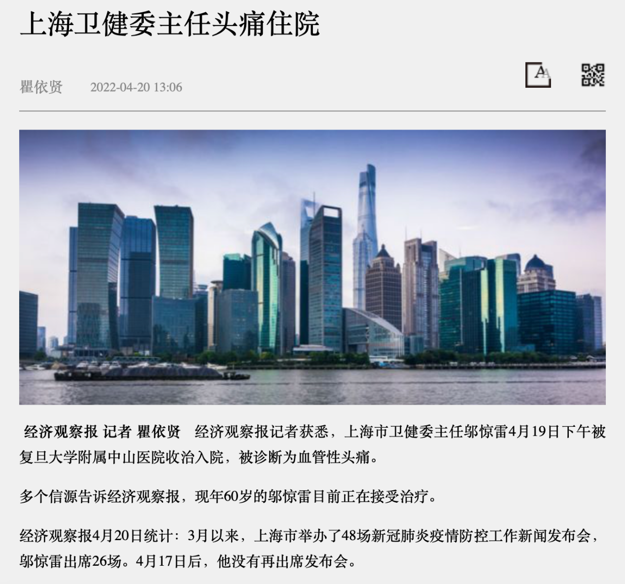2022年4月19日,瞿依贤将网上流传的上海卫健委主任入院消息的图片发到了工作群。在求证了多处信源后,她抓住这件事情的天然新闻价值,动笔整合所了解的信息,在《经济观察报》发出了一则“上海卫健委主任头痛住院”的报道。虽然报道篇幅不长,不到150个字,但当时处于疫情防控时期的上海被全国人民关注,这则消息一经发出就引发了重大关注,成为上海战“疫”一线无数报道中一个生动且有力的注脚。