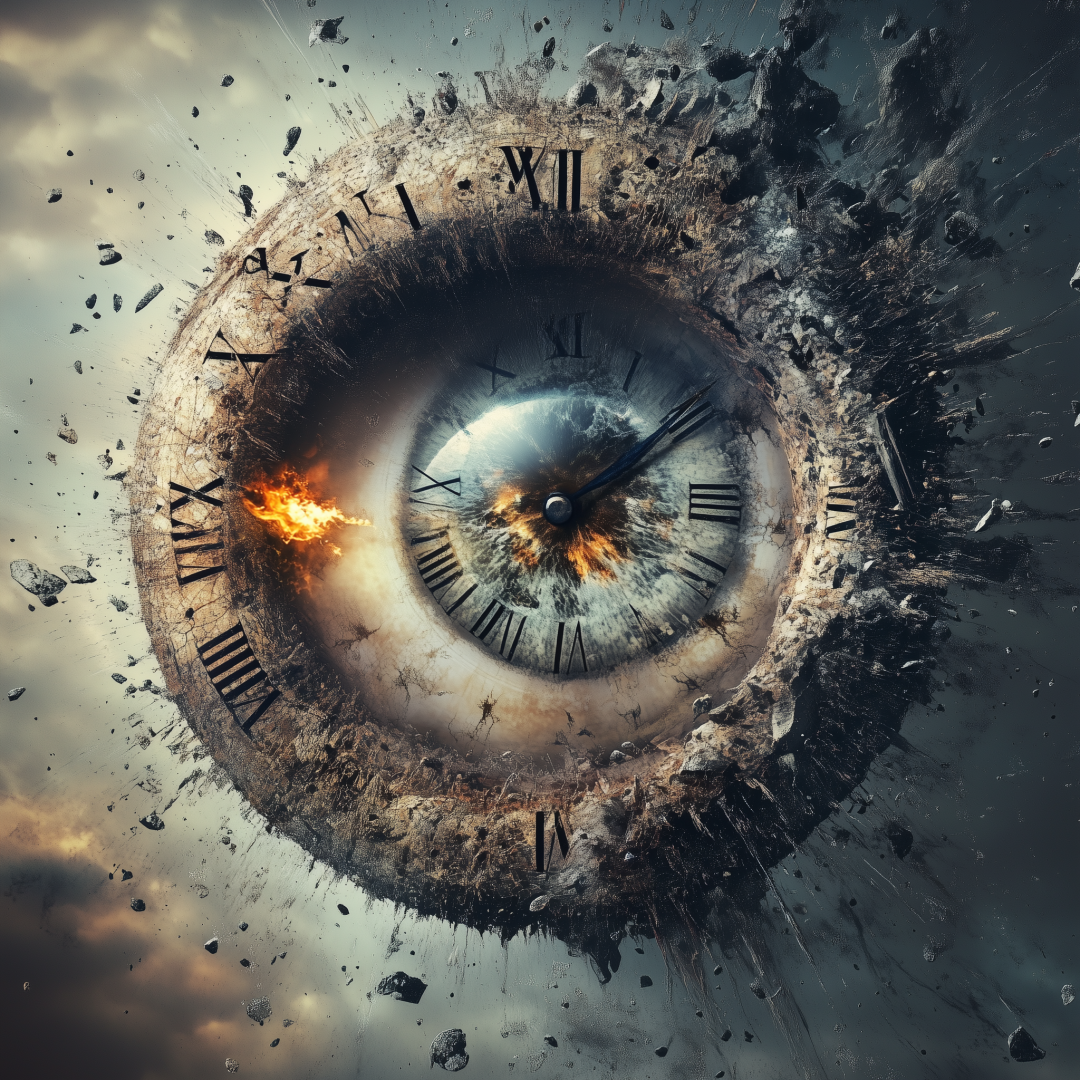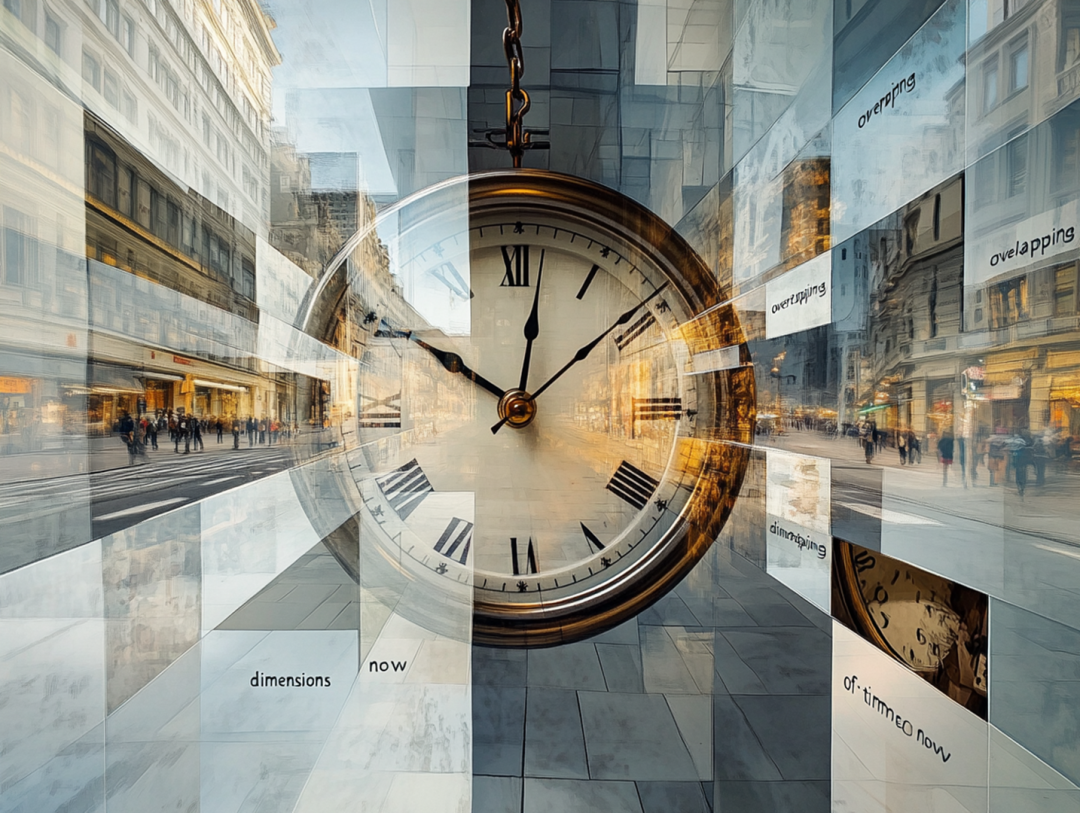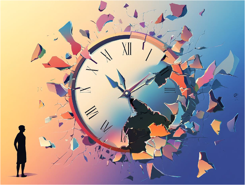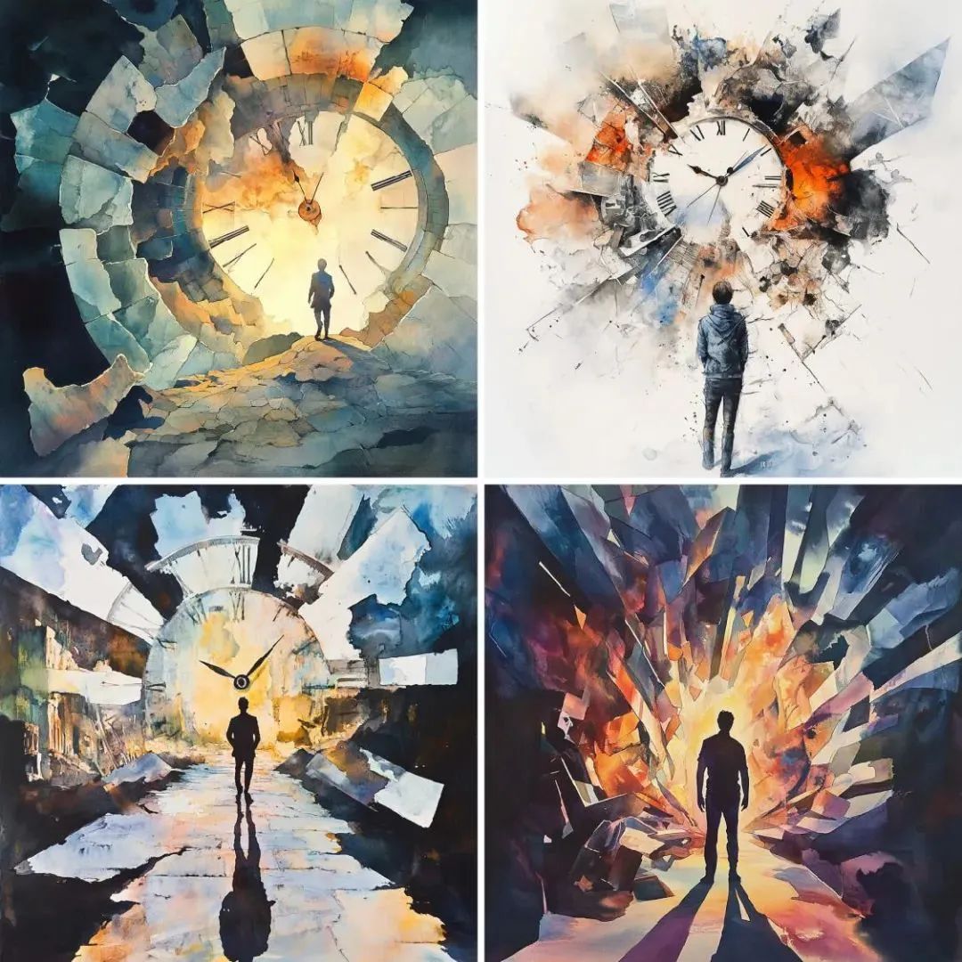 时间的流逝是连续的,但我们常常在某些时刻感到它被打断、错位或无法控制。不对称的时钟碎片、裂开的日历页,或断裂的物体,象征时间在个体感知中的不稳定性。
