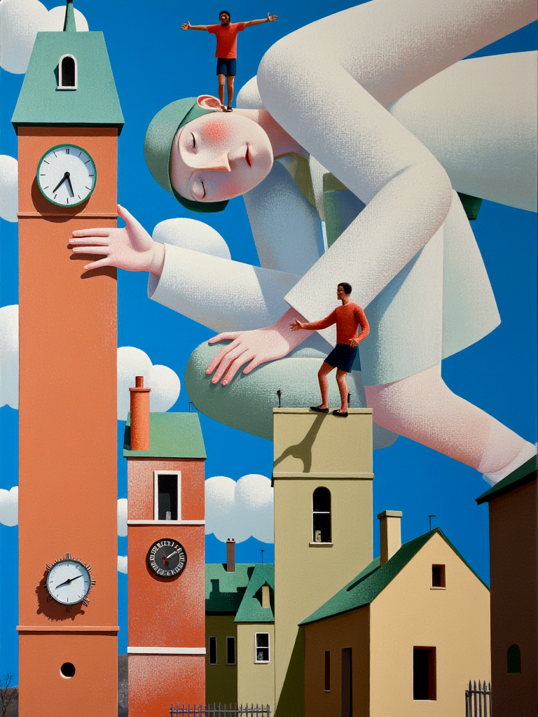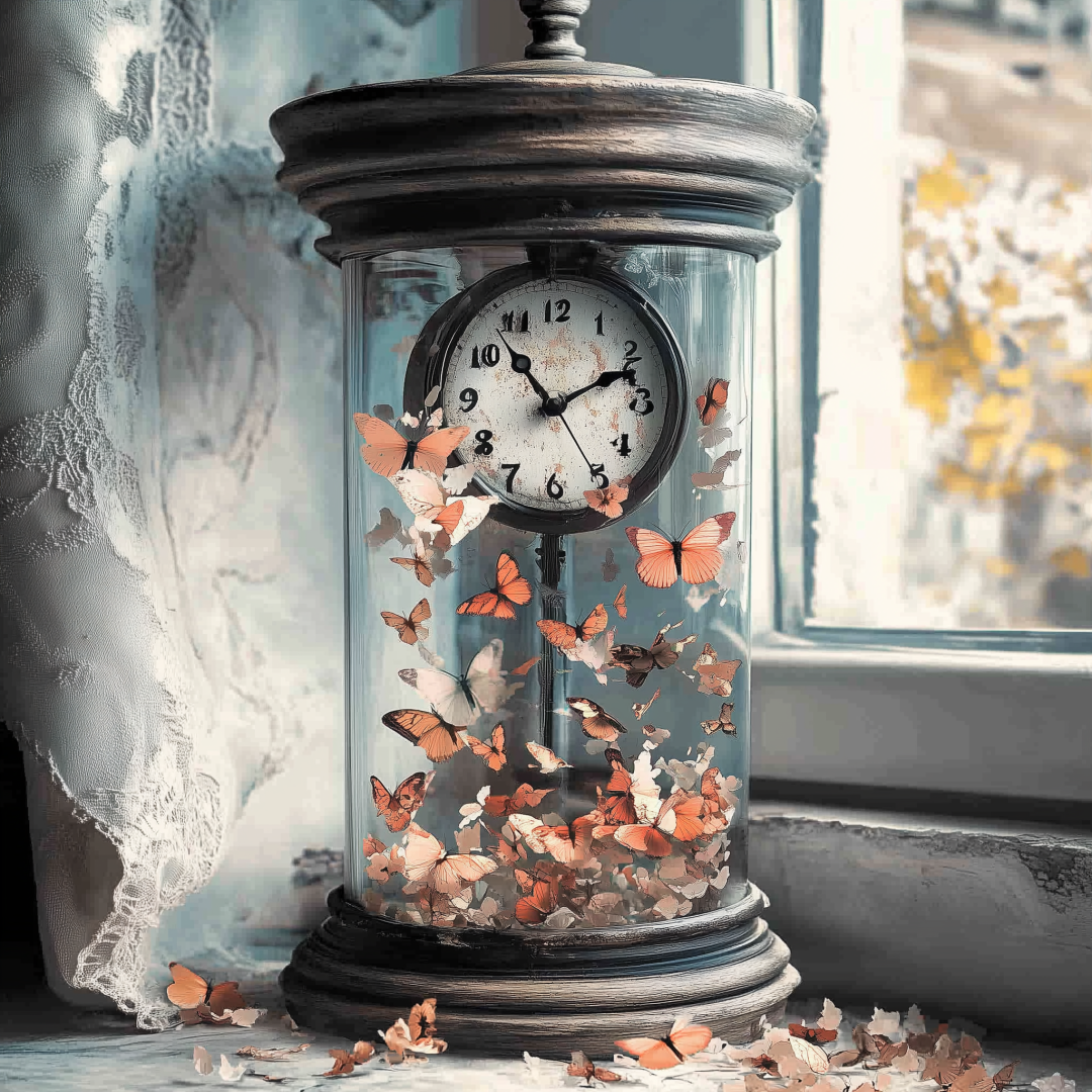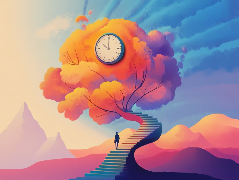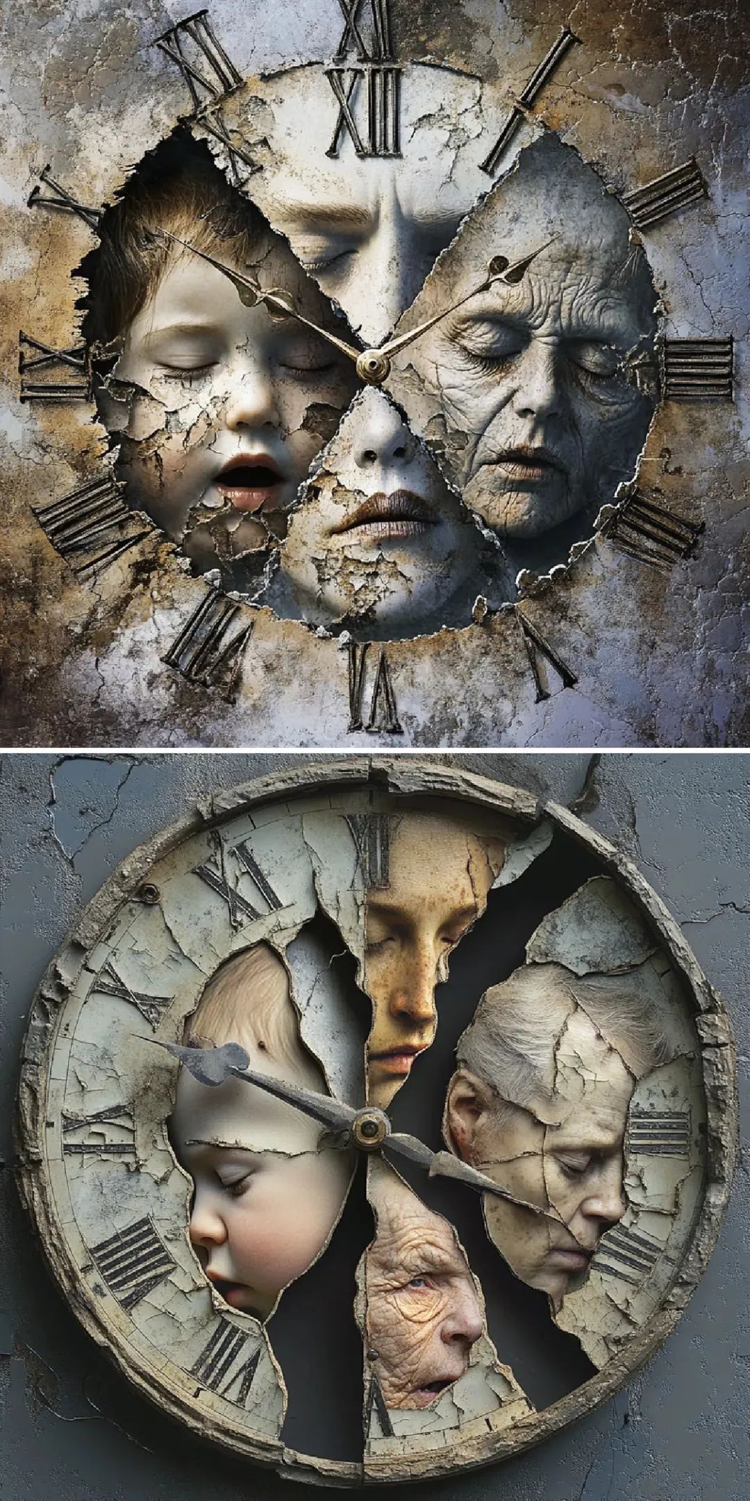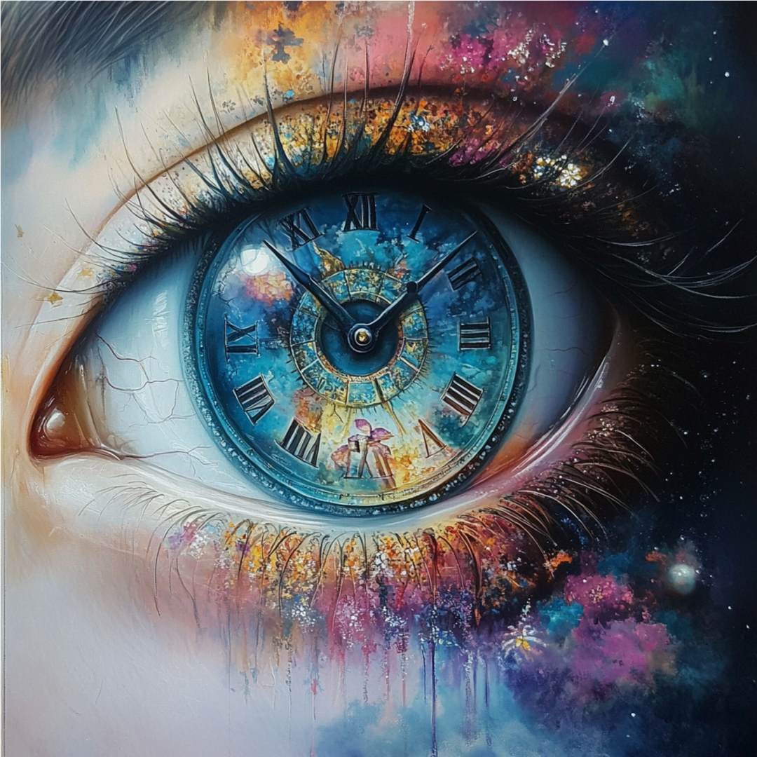 时间的流逝是连续的,但我们常常在某些时刻感到它被打断、错位或无法控制。不对称的时钟碎片、裂开的日历页,或断裂的物体,象征时间在个体感知中的不稳定性。