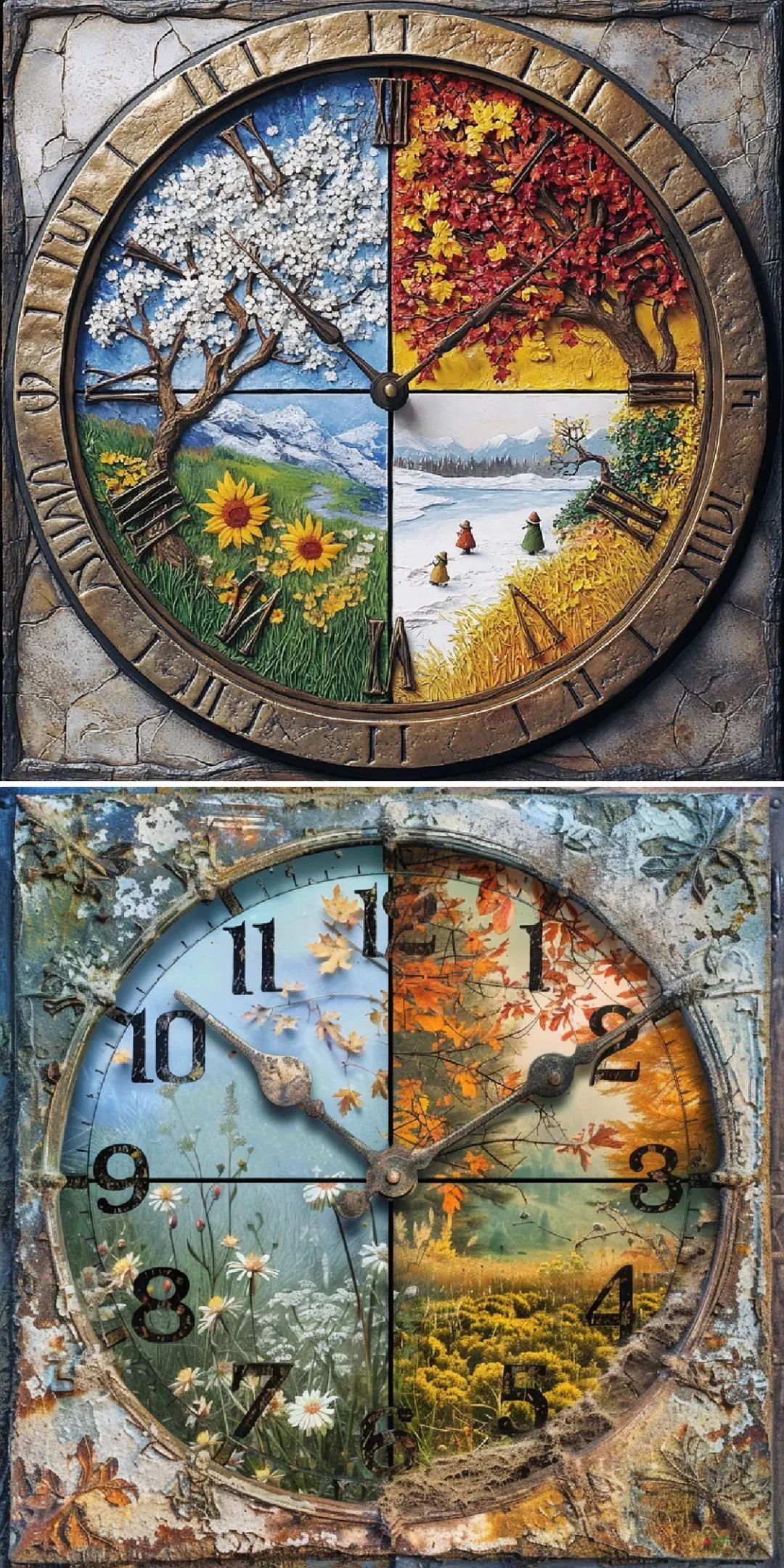MJ / #prompt:A detailed clock face with clear, elegant numerical markings around the edges, its surface divided into four quadrants depicting the same natural scene across different times of the day. The top-left quadrant shows a serene dawn with soft pink and gold hues, the top-right depicts a bright noon with vibrant blue skies, the bottom-right illustrates a warm sunset with orange and red tones, and the bottom-left captures a tranquil midnight with deep navy blues and stars. The bas-relief style adds depth to the textured scenes, while the metallic rim of the clock glows subtly under diffused lighting. Created Using: neoclassical design aesthetics, multi-depth carving, soft gradient blending, fine details, hd quality, precise transitions, time-inspired symmetry –ar 1:1 –v 6.0