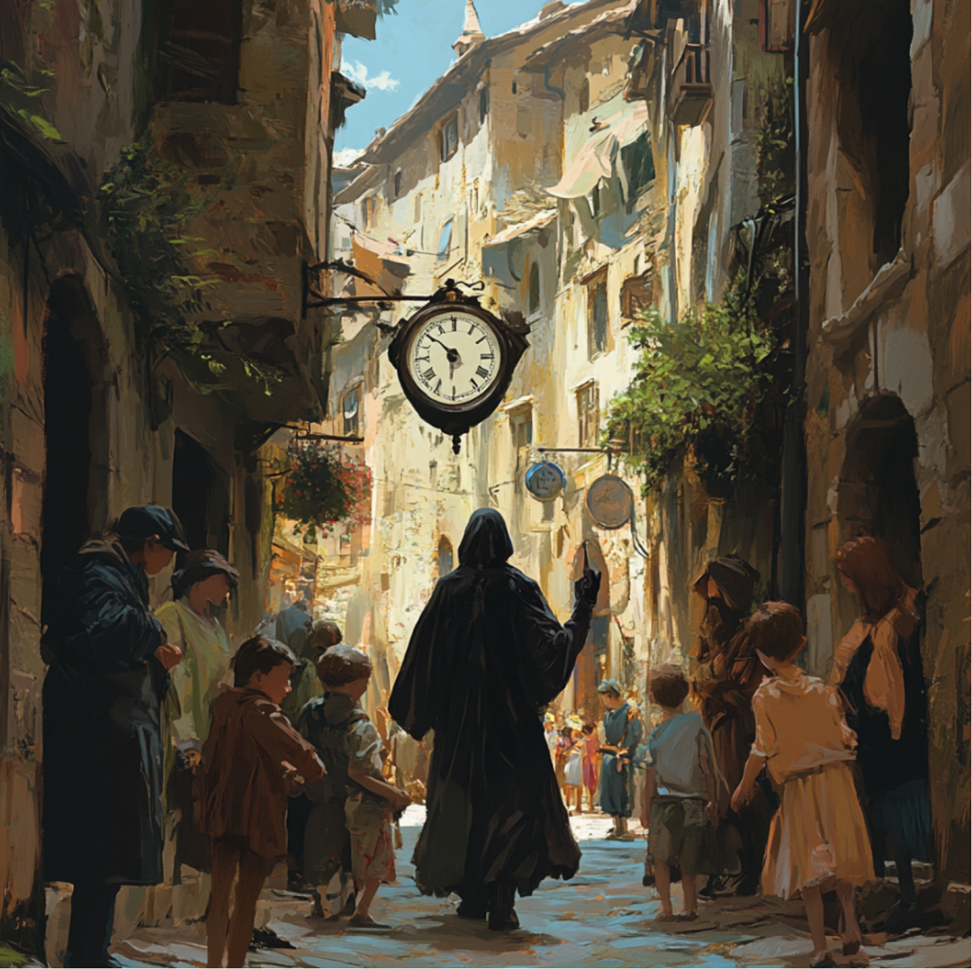 MJ / #prompt:realist style; In the middle of the creen, there is a time messenger dressed in a black robe holding a clock and walking through a small alley. On both sides of the alley, people of different ages are doing their ownactivities. Hasbright color tones; The Time Messenger looked at the children around him with a smile, but no one around him looked at him;ar1:1