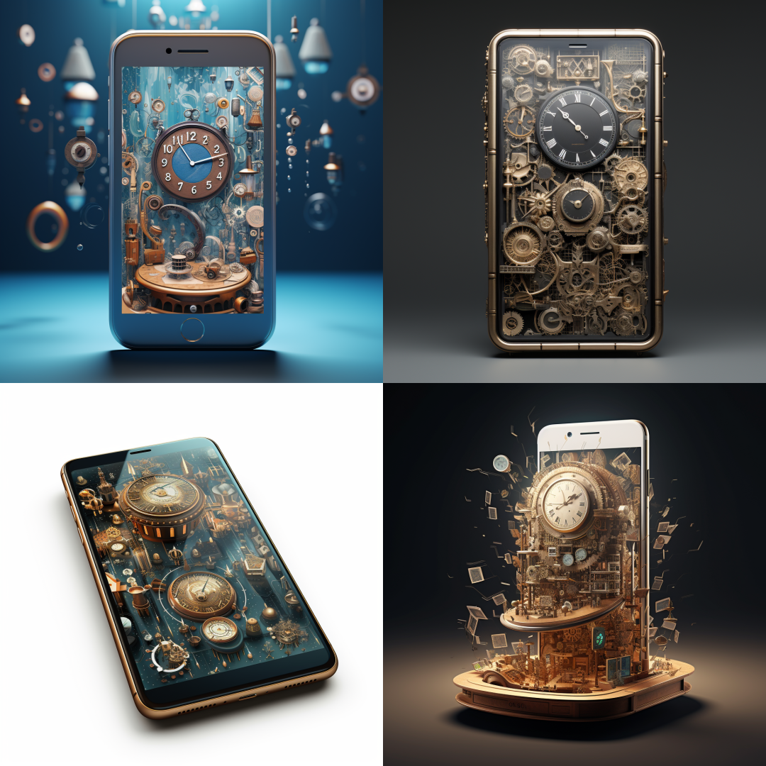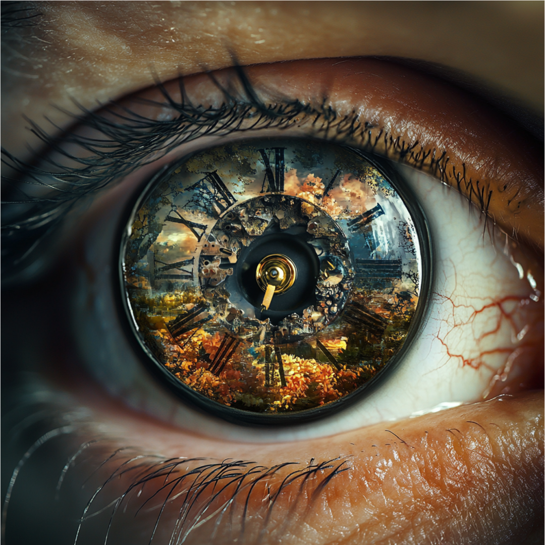 MJ / #prompt:Surrealistic abstract time perception, overlapping melting clocks, distorted figures, and fragmented landscapes. Show past, present, and future coexisting in one scene, with stretched and compressed elements, representing psychological time manipulation. Use vibrant gradients, contrasting light and shadow, and broken timepieces to evoke emotional shifts and subjective time flow