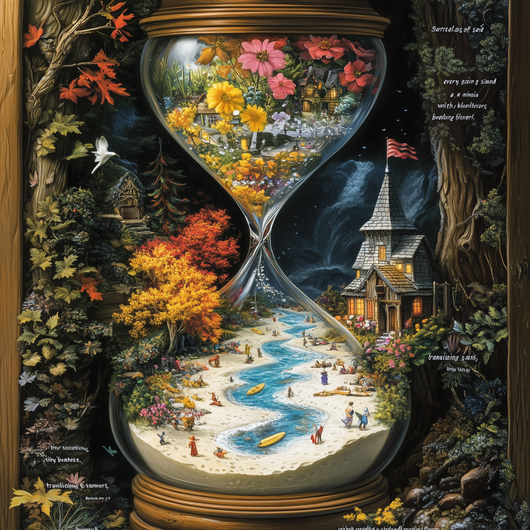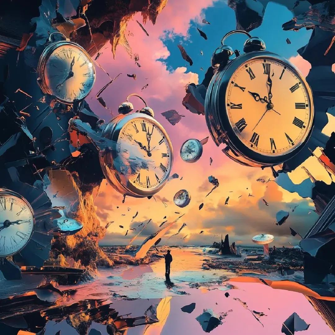 时间并不是线性发展的,而是循环往复。通过呈现周期性重复的符号,如太阳与月亮交替、四季变化等,来表达时间的循环性。超现实的画面可以把这些元素变形或错位,以表现时间在个体感知中的无穷延续。