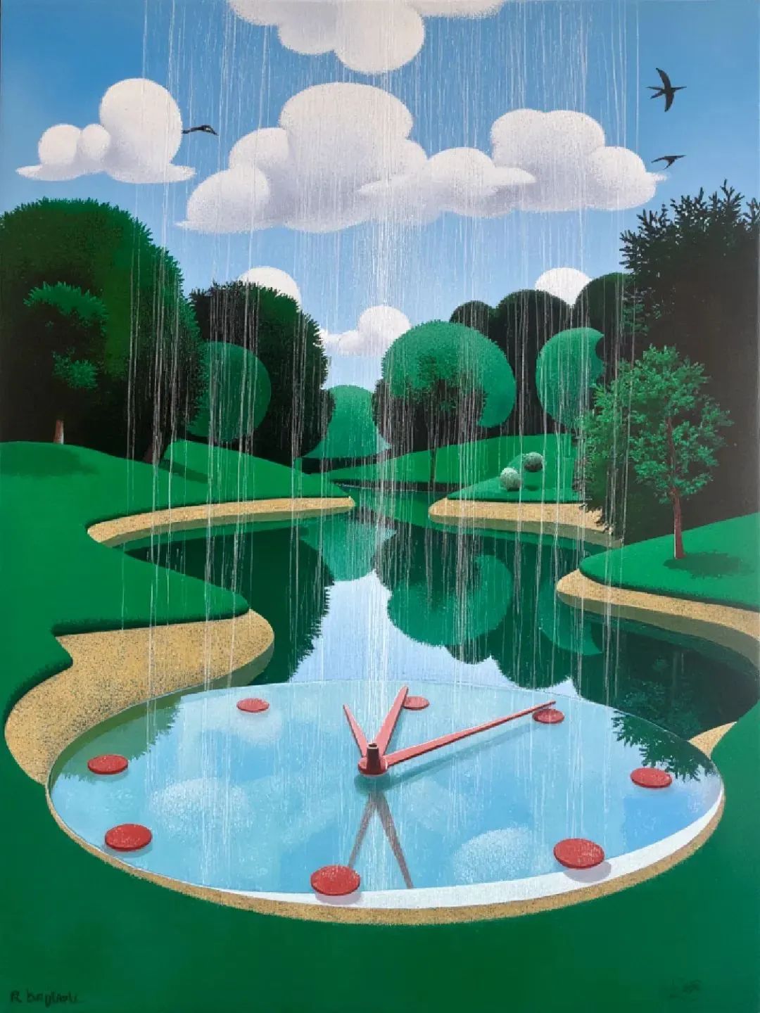 Liblib AI / #prompt:Surreal, kelimute_bb, Heavyrain, The heavy rain fellvertically, the sky isclear, the wind isstrong, the trees are lush, black clouds, The lake is as calm as amirror, the lake is irregular in shape, the lake looks like a clock, with numbers and pointers, oil painting artwork, This art work is reminiscent of Gustav Kimt's style, industrial, and atmospheric style with vibrant colors and strong contrast, the lake was a transparent clock,(重绘:heavy rain)