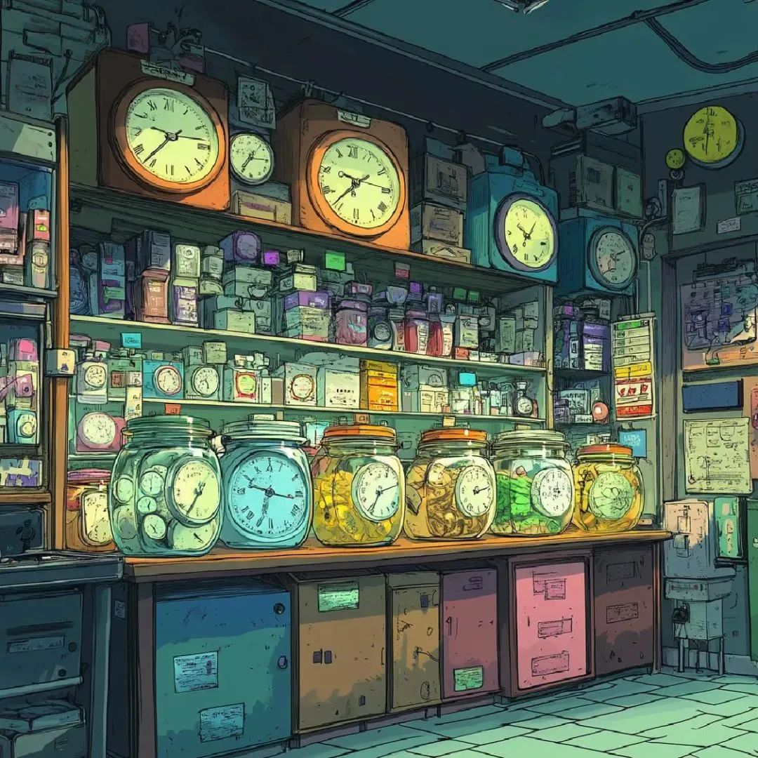 MJ / #prompt:A time convenience store, comic style, jars shaped like clocks, various items in the shape of time symbols such as hourglasses, sundials, and watches, warm and whimsical atmosphere, vibrant colors, detailed line art, imaginative and surreal design