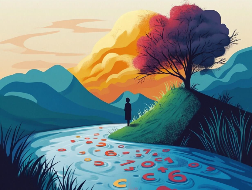 MJ / #prompt:a river, a lot of correct numbers under the river, a person silhouette on the bank, flat style, abstract style, minimalist gradient style, Initial style