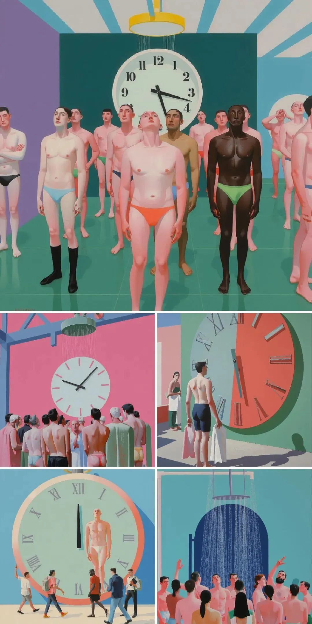 MJ / #prompt:A lot of people were standing,looking ahead and wearing only underwear,with a sprinkler overhead that was spraying water. This shower is very large so that everyone can get caught in the water.Viewed from below.,Oil painting, this work is reminiscent of the style of Gustav Ginz,industrial and atmospheric style,bright colors,strong contrast,