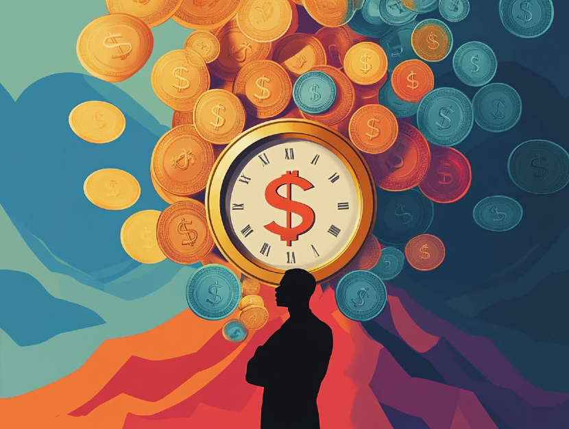 MJ / #prompt:clock like a coin with money symbols, golden coin, a black person silhouette, a lot of money, a lot of coins, flat style, abstract style, minimalist gradient style,Initial style