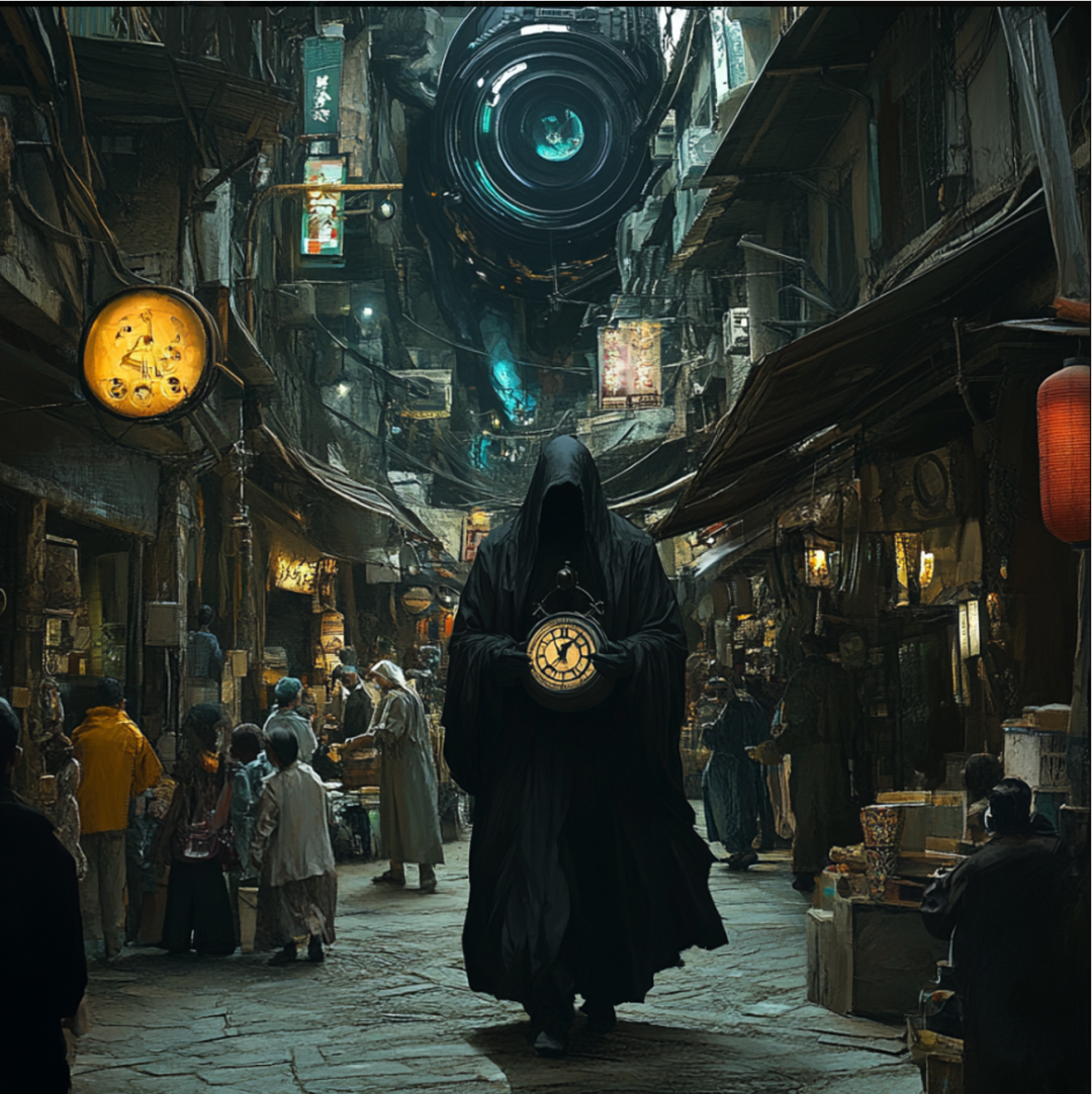 MJ / #prompt:Dark sci-fi style; In the middle of the screen, there is a time messenger dressed in a black robe holding a clock and walking through a small alley. On both sides of the alley, people of different ages are doing their own activities.-- ar 1:1
