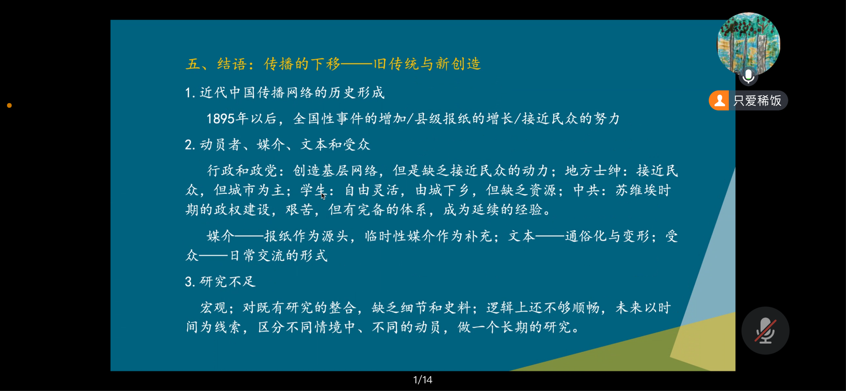 讲座尝试打破政治时间/事件的区隔,重点探讨了近代县级传播网络建设、学生群体作为讯息下沉的中介以及中国共产党对群众日常交流的组织等议题,由此在相对长时段中思考20世纪中国传播网络下移的历程,以及各传播要素在此过程中的变与不变。