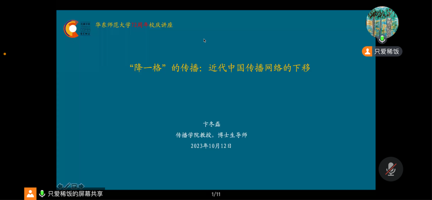 2023年10月12日下午,h动漫 卞冬磊教授在云端开展校庆学术讲座,重点探讨了近代中国传播网络的下移。
