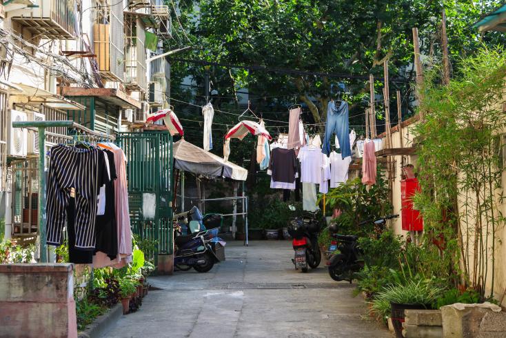 曹杨七村内,居民将衣服、被单挂在户外晾晒