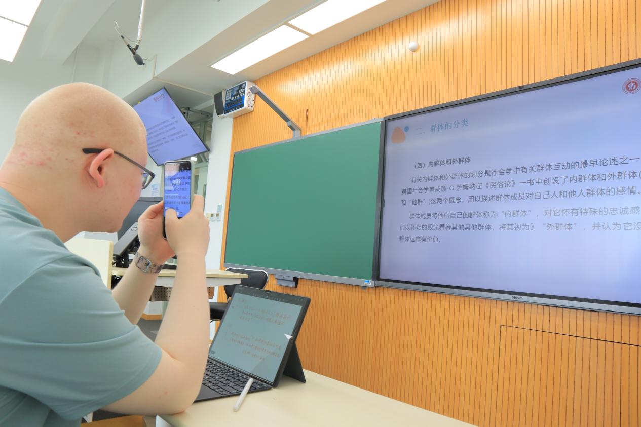 上了大学,听课对他来说又是一道难题。戴着眼镜坐在第一排也是徒劳的,挽救的办法是整节课举着手机放大黑板上的内容。