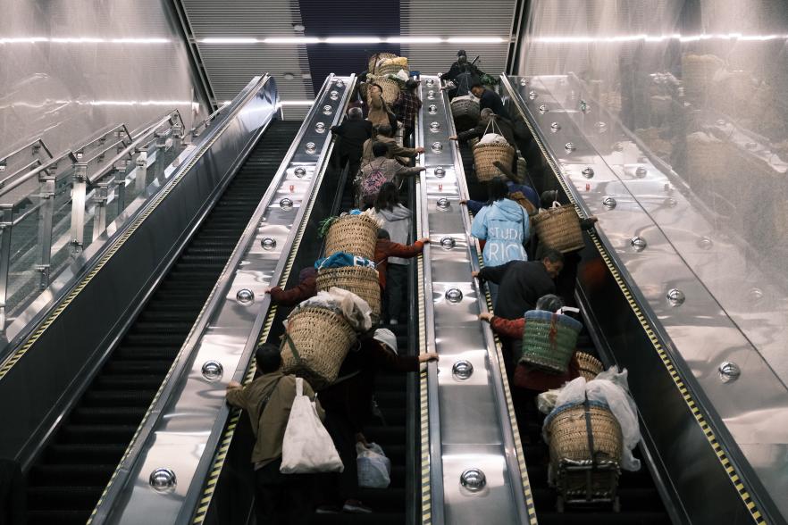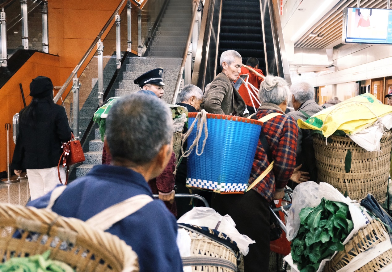 开步去乘扶梯。好在这群“背篓客”有着自己的生活哲学——“不争不抢,凡事‘算老’”。每当拥堵之时,这群菜农中就会响起此起彼伏的“算老”、“莫急”、“让哈他嘛”......就这样,在短暂的“堵车”后,菜农们终于顺利依次乘上了扶梯。