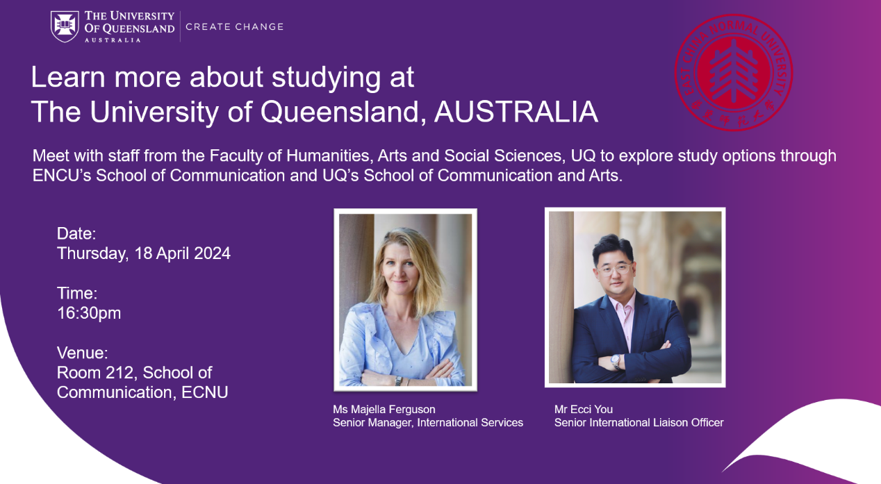 预告 | 华东师大h动漫 -昆士兰大学人文与社会科学学院本科双学位项目宣讲会