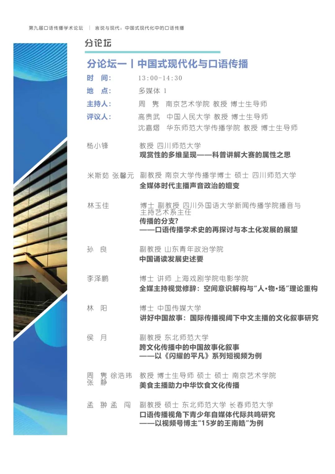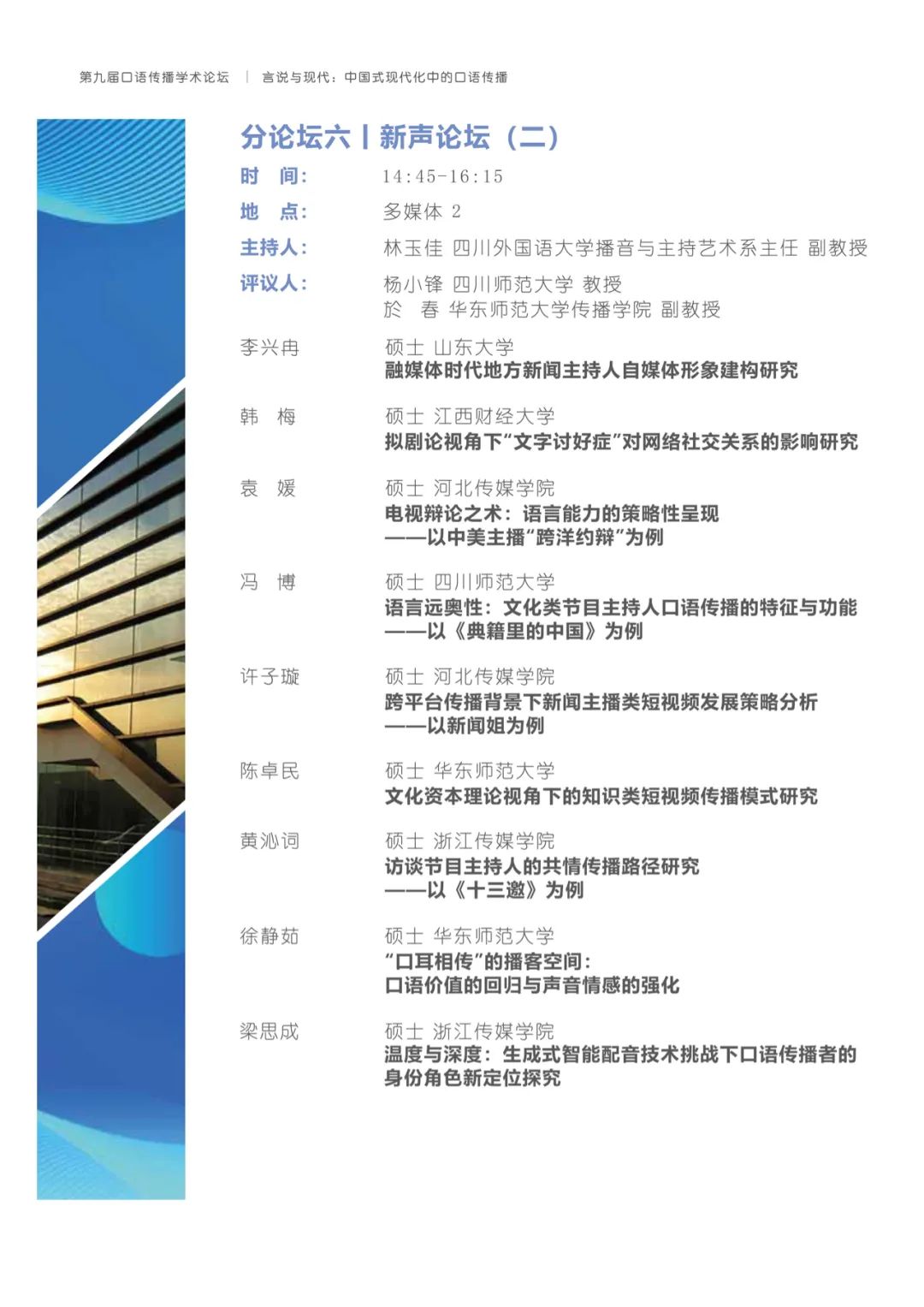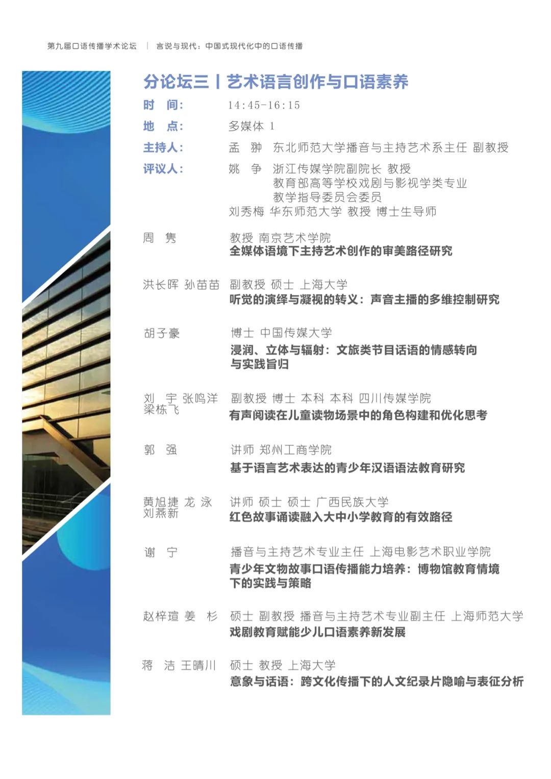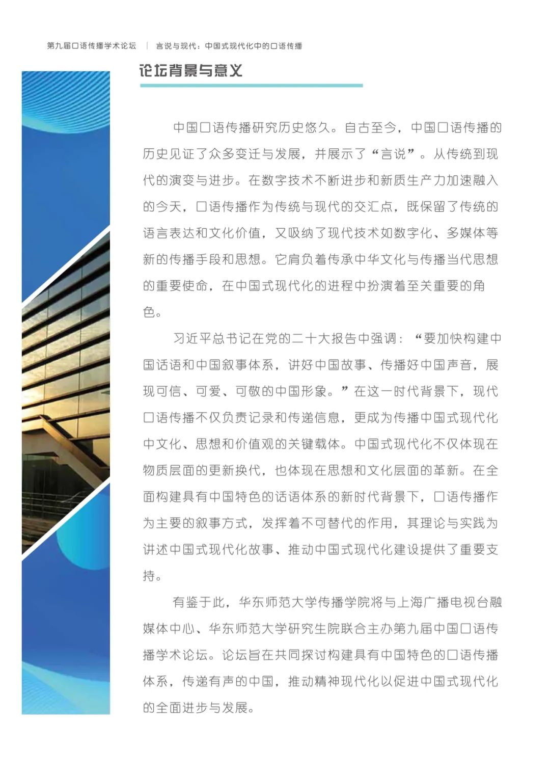 有鉴于此,h动漫 将与上海广播电视台融媒体中心、h动漫 研究生院联合主办以“言说与现代:中国式现代化中的口语传播”为主题的第九届口语传播学术论坛。论坛旨在共同探讨构建具有中国特色的口语传播体系,传递有声的中国,推动精神现代化以促进中国式现代化的全面进步与发展。