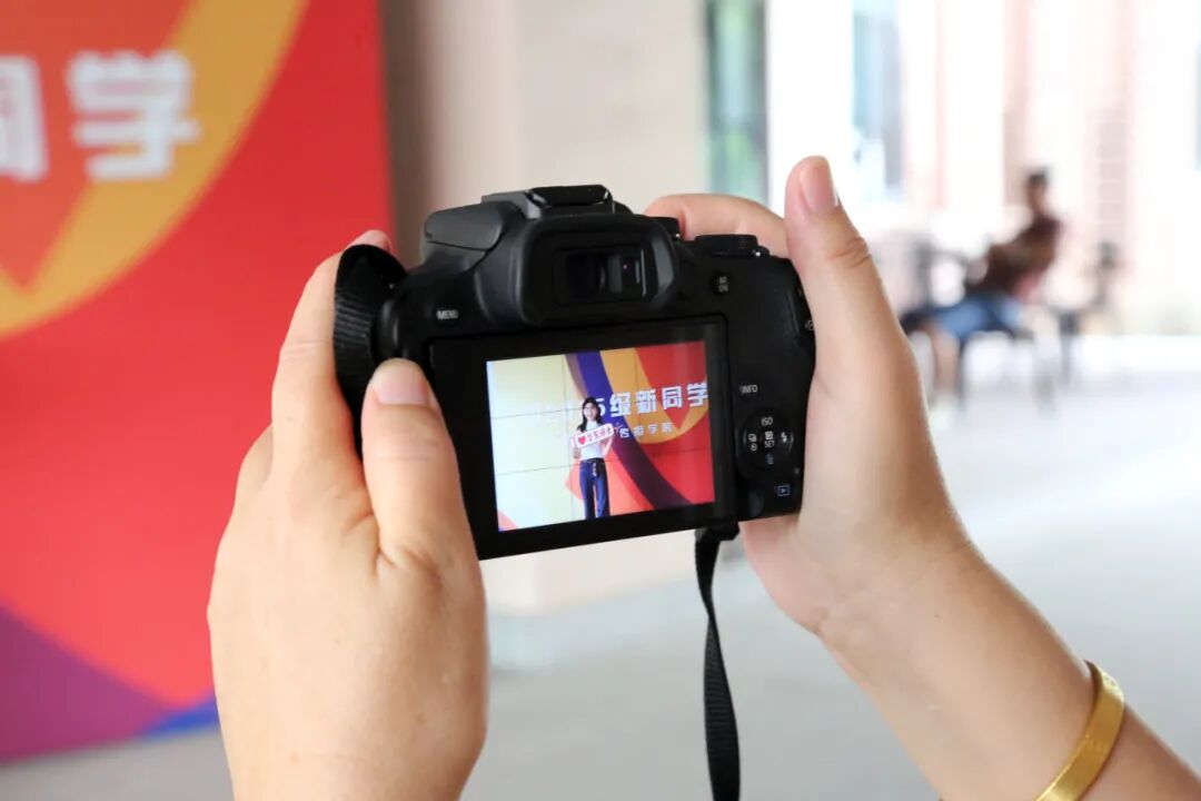 笑颜在迎新展板前定格